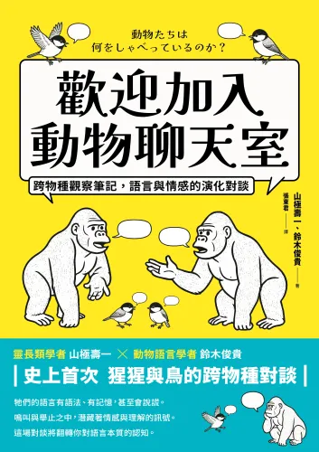 近年研究顯示,動物的訊息系統並非人類語言的延伸,而是由生態脈絡形塑。白頰山雀以音節的組合與排序傳遞警戒與集合;綠猴依天敵類型分化叫聲;大猩猩以姿態與聲音回應記憶與關係,映現知覺、情緒與社會性的交互作用。 那麼,面對這些發現,我們該如何讀懂牠們的訊息? 本書由動物語言學家鈴木俊貴和靈長類學者山極壽一,展開一場知識豐富、精彩絕倫的深度對談。從白頰山雀的音節組合、綠猴的天敵訊號,到大猩猩的親密互動與聲調;討論節奏如何引發共鳴,手勢如何轉成符號,何時出現「假警報」,何時形成真正的協作。 兩位學者以實驗與田野相互印證,從實驗室走到熱帶雨林,循證梳理聲音、手勢與群體合作的線索,層層拼出語言誕生的脈絡與社會連結的路徑。 透過跨物種視野,我們得以重置溝通、理解與合作的邊界,重新理解我們作為「人類」的本質。 這不只是一本動物語言的研究紀錄,也是一種試圖跳脫人類尺度、重新理解語言與生物行為的探索方式。透過這場跨越分類群與學術邊界的對談,我們或許可以看見另一種「溝通」的可能性。